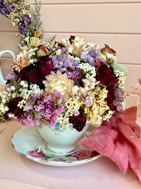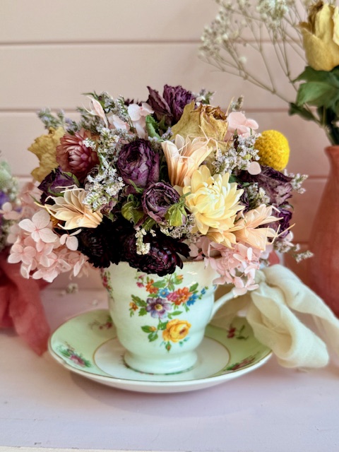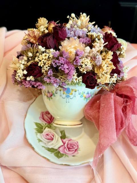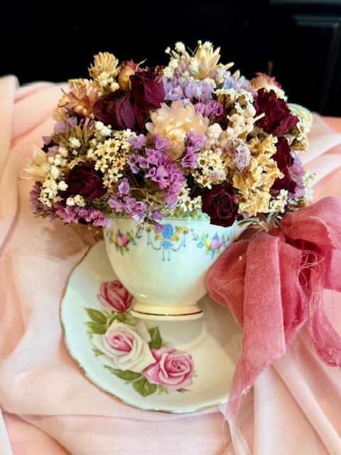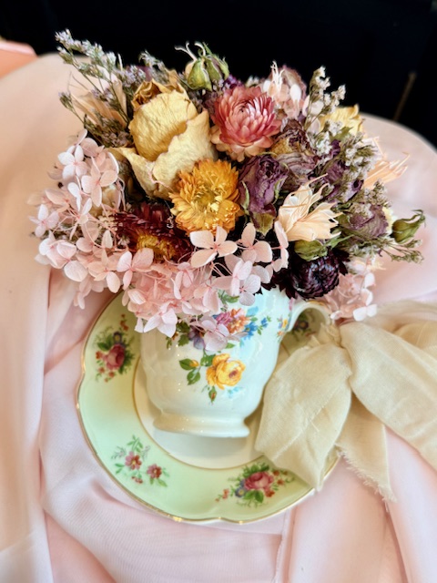 The teacup and saucer are yours to keep. Once the flowers have had their moment bring the cup back to us and we’ll refill it with a fresh arrangement of your choice — dried or fresh — for an additional fee. Year after year it becomes something she expects. That’s the kind of gift that never gets old.