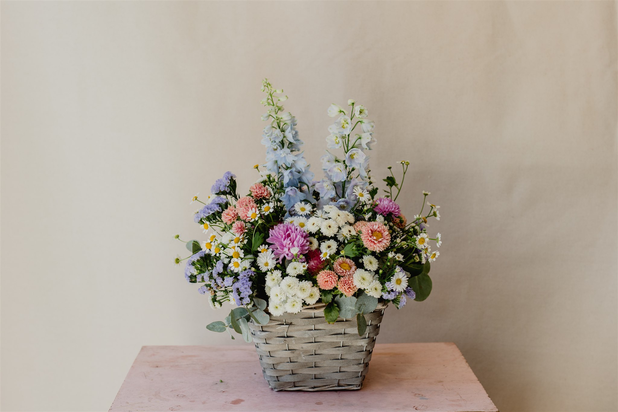 A meadow style arrangement of delicate, seasonal flowers, presented in a French style grey wicker basket.