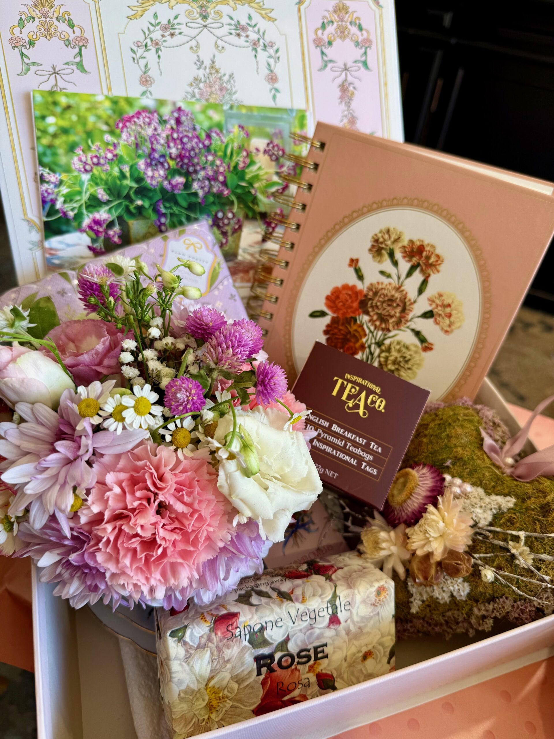 Each hamper is beautifully presented in a gift box (while stocks last), or a gorgeous basket. Inside she will find a handcrafted vintage teacup posy, a hand milled soap, a writing book, a small tea, a moss heart, serviettes and a greeting card. It is everything she deserves in one stunning package.