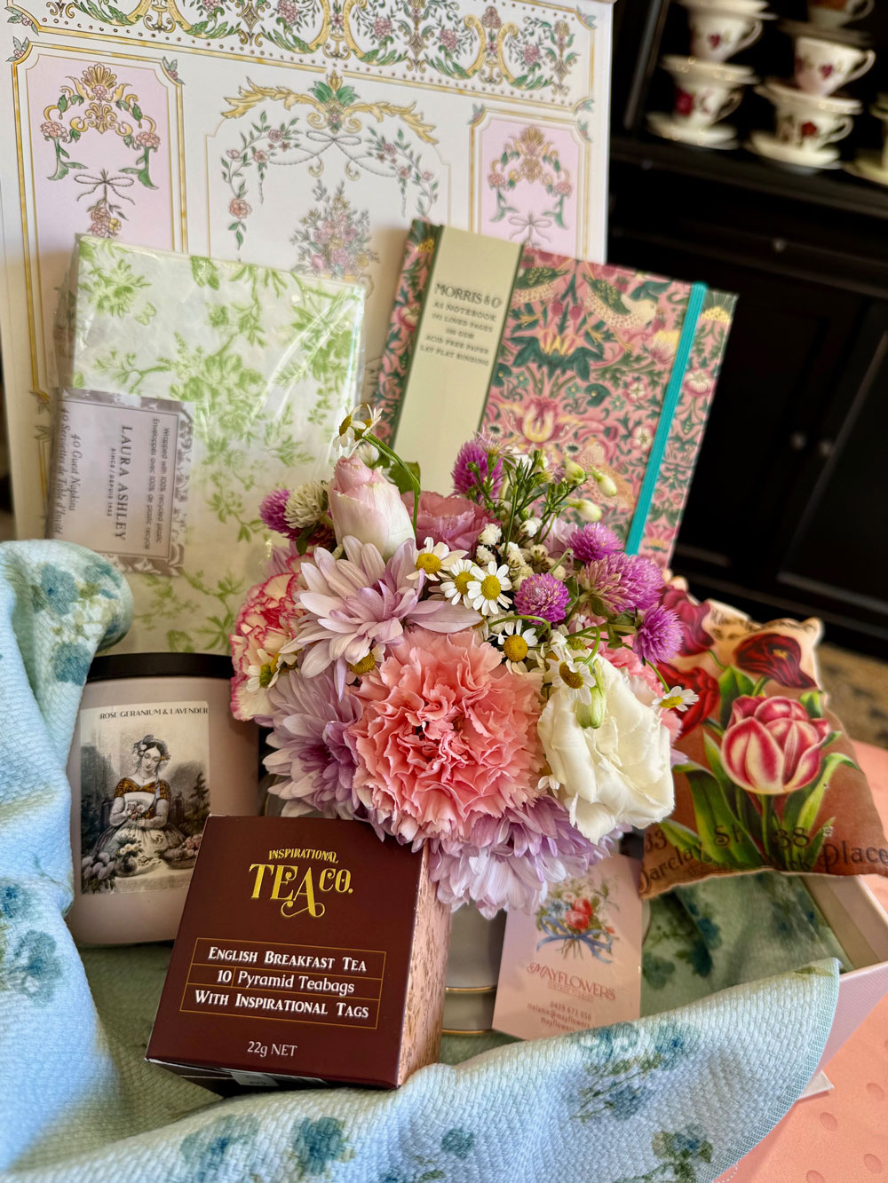 Arriving in a gift box (while stocks last) or a beautiful basket, the Lady Whistledown Hamper is filled with a Lazybones soy candle made in Australia, a tea from Inspirational Tea Co, a set of serviettes, a vintage teacup posy, a scented sachet, a writing book and a tea towel. Serviette prints, writing books and tea towels may vary depending on availability and each will be chosen to complement the overall look and feel of the hamper beautifully.
