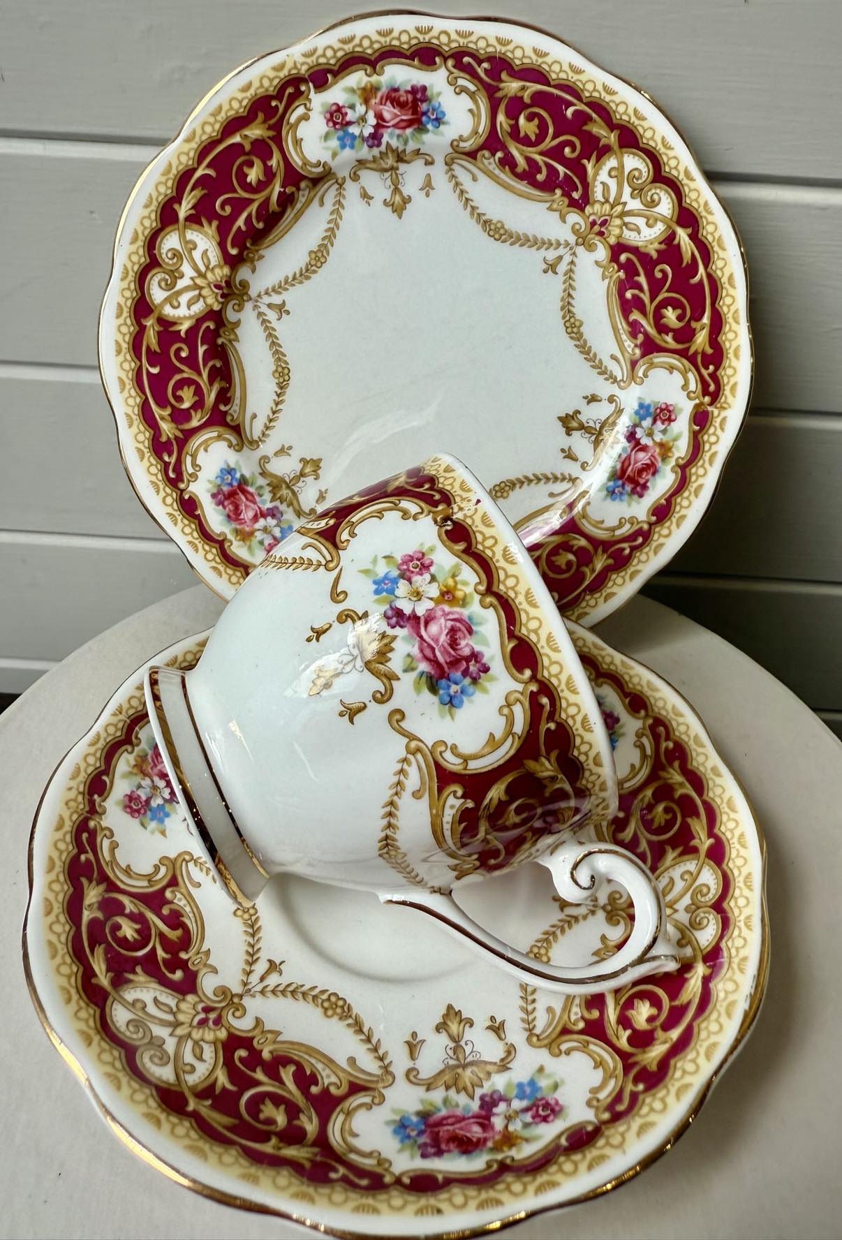 This Queen Anne set has Burgundy, pinks, blues and yellow floral design.