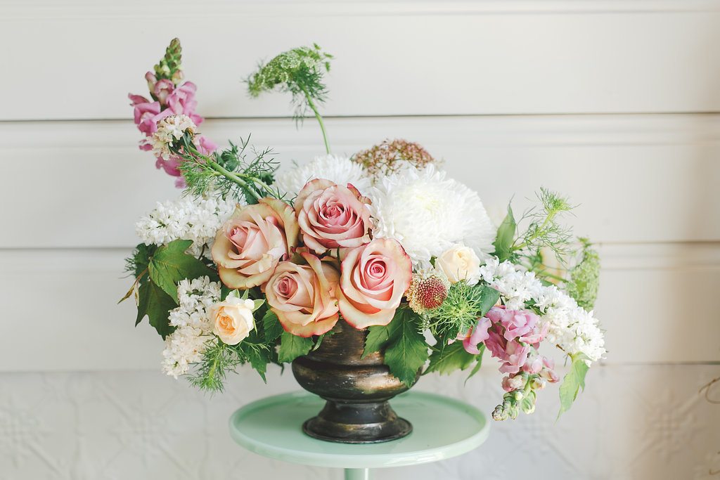 Straight out of a Downton Abbey scene comes this elegant arrangement full of roses and seasonal flowers.
