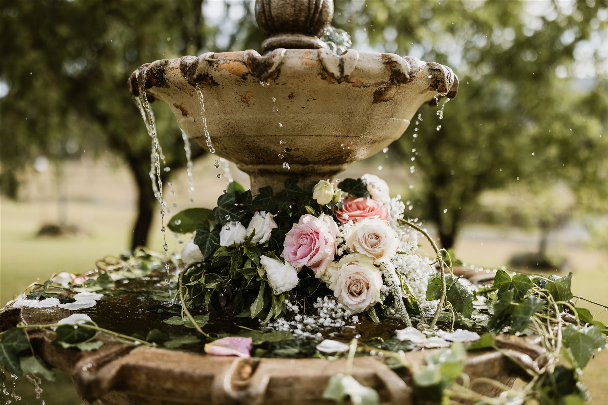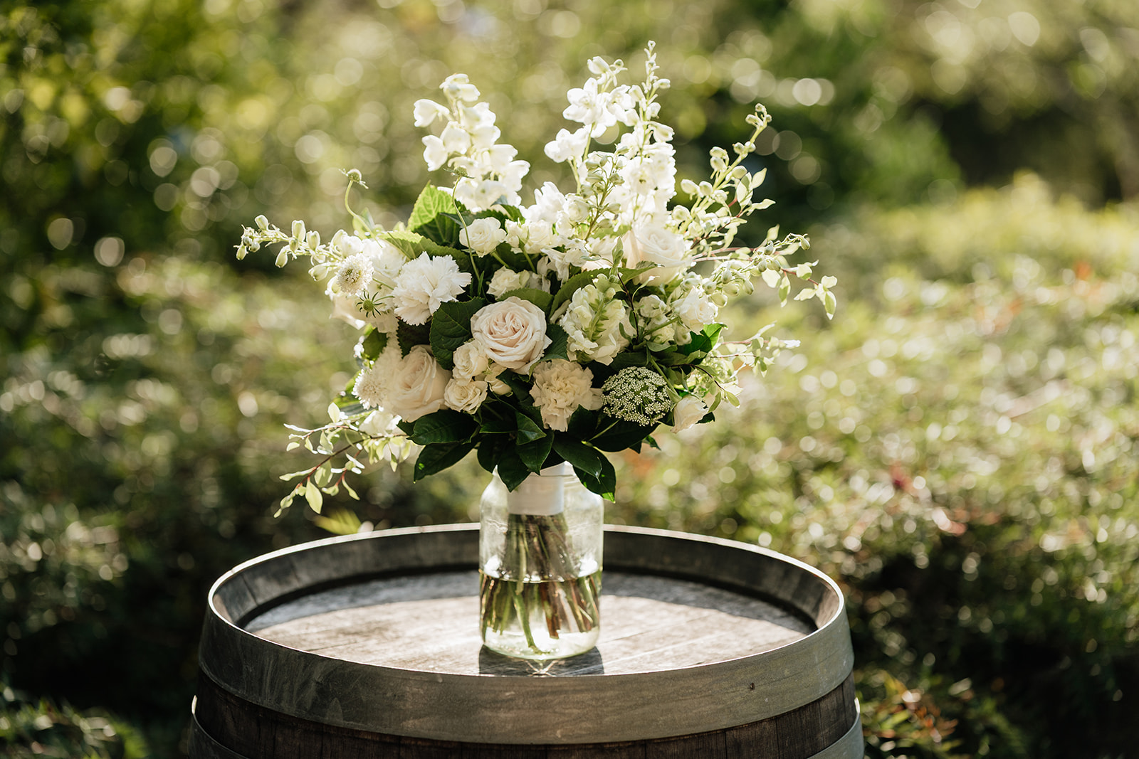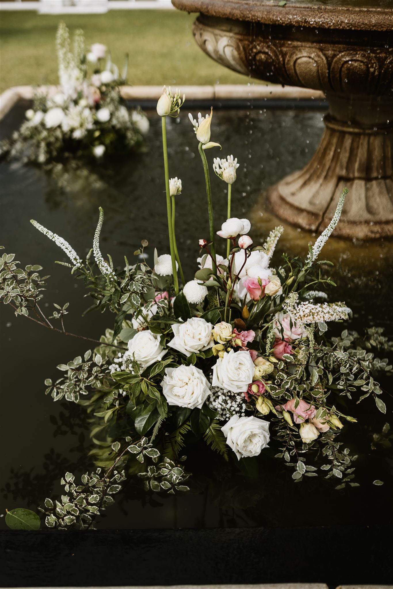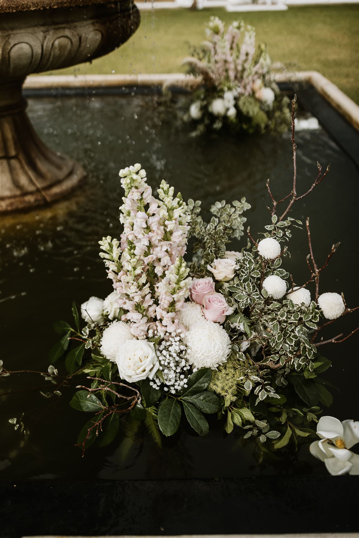 Mayflowers created gorgeous arrangements to place in the water fountain for the ceremony and even waded in the water feature to place stunning arrangements around to decorate the outside gathering space. It was beautiful.