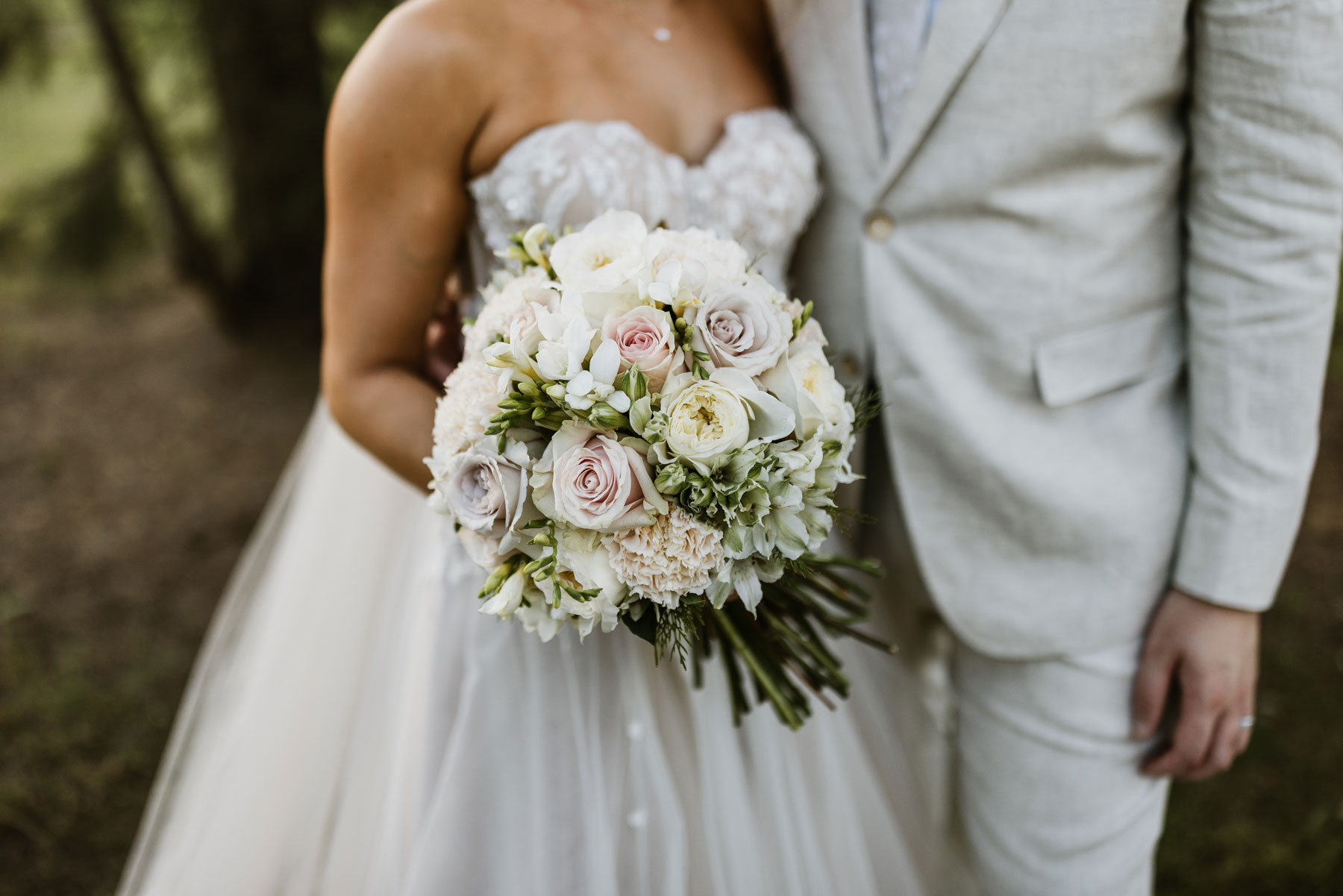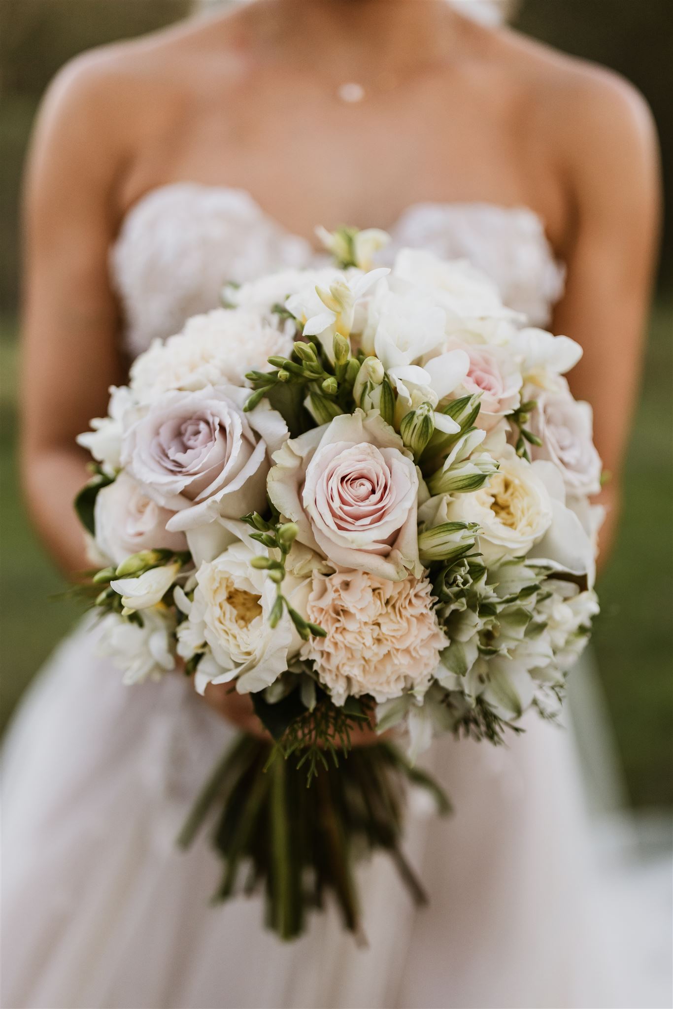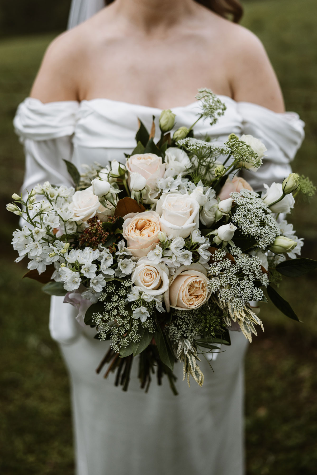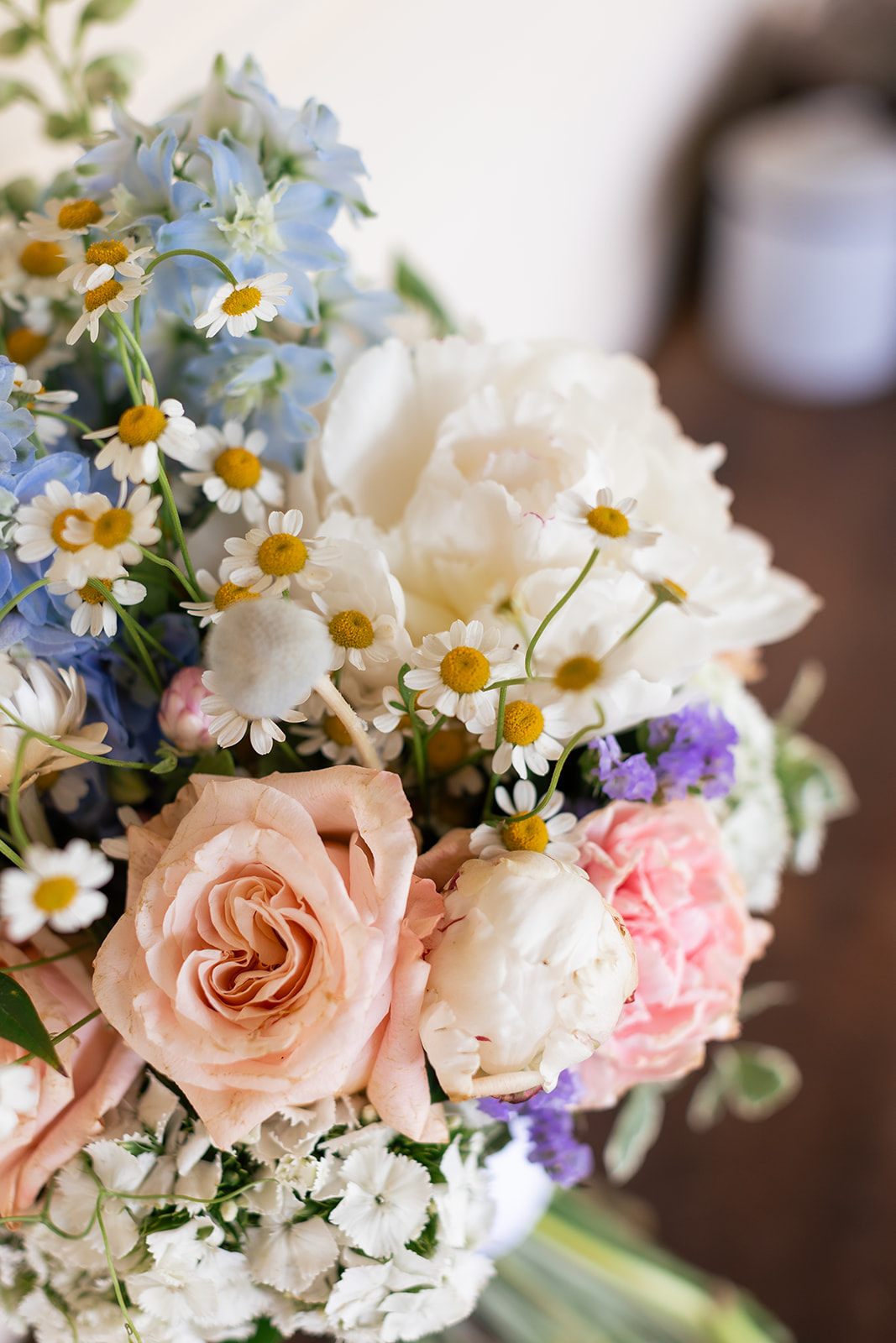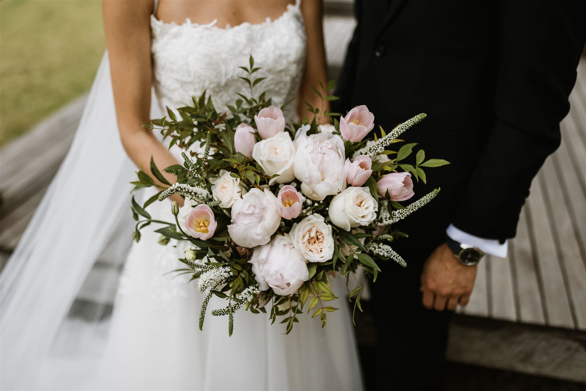 The bride carried a bouquet featuring peonies, shell pink tulip, roses, Veronica, lissianthus, Nandina and camellia.
