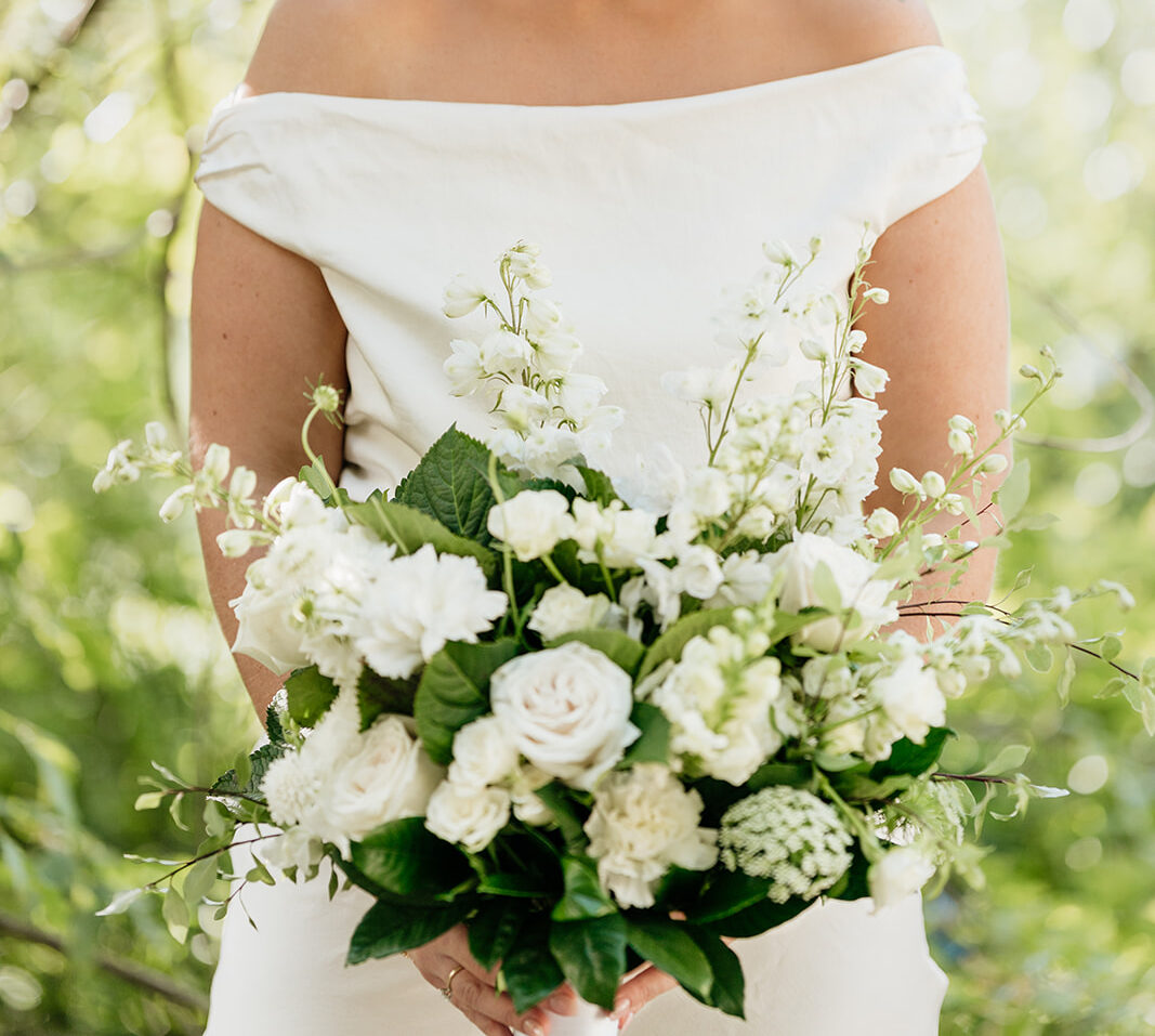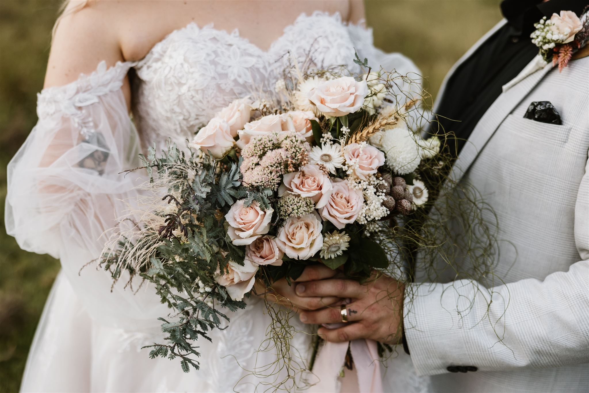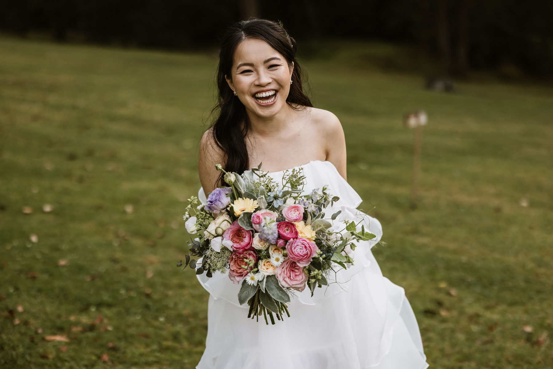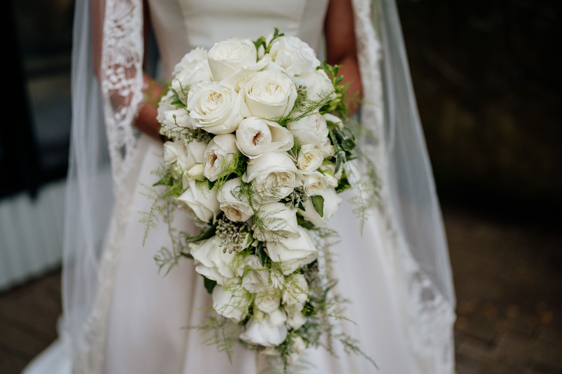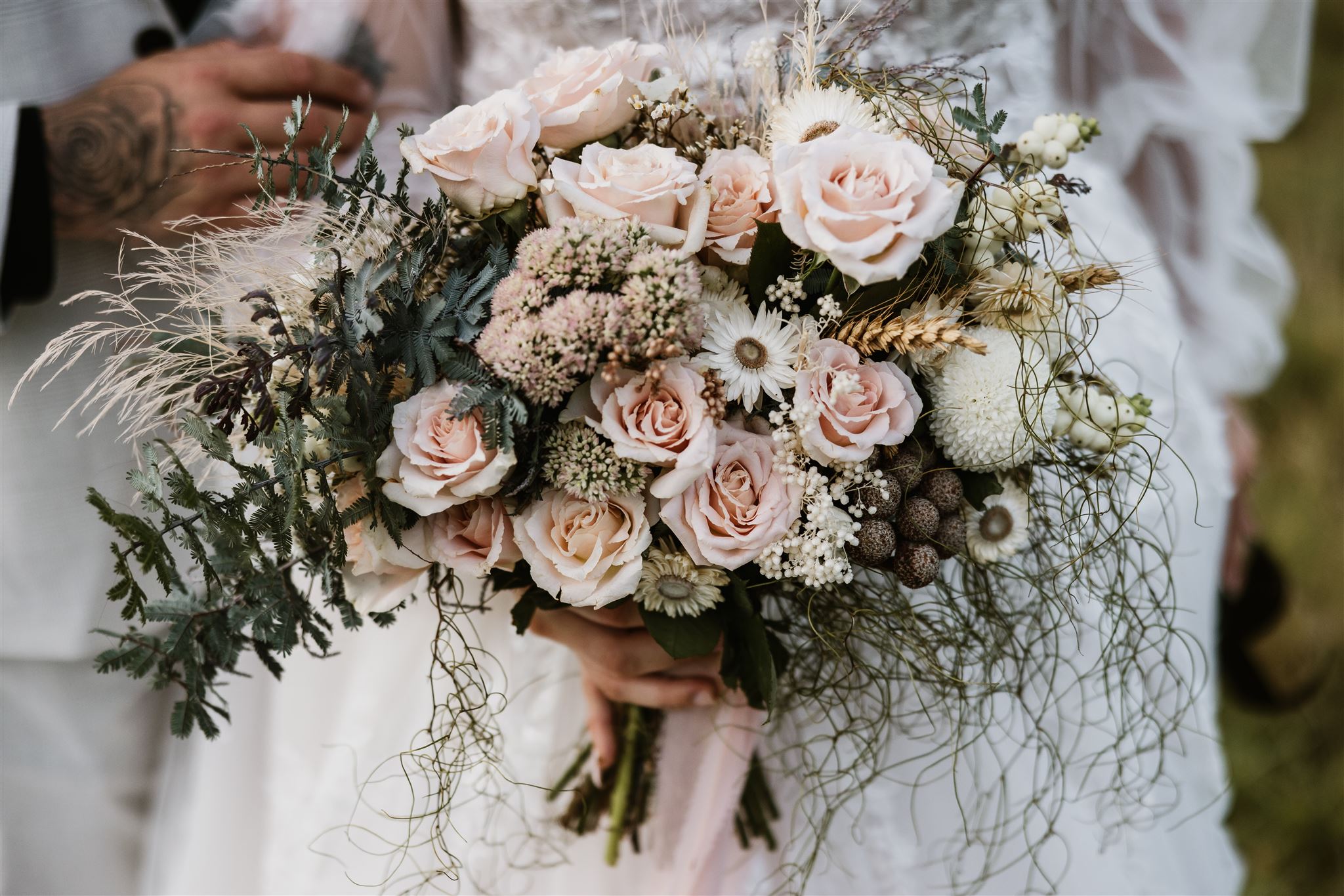 The bride carried a bouquet featuring peonies, shell pink tulip, roses, Veronica, lissianthus, Nandina and camellia.
